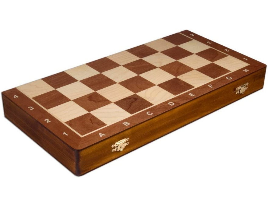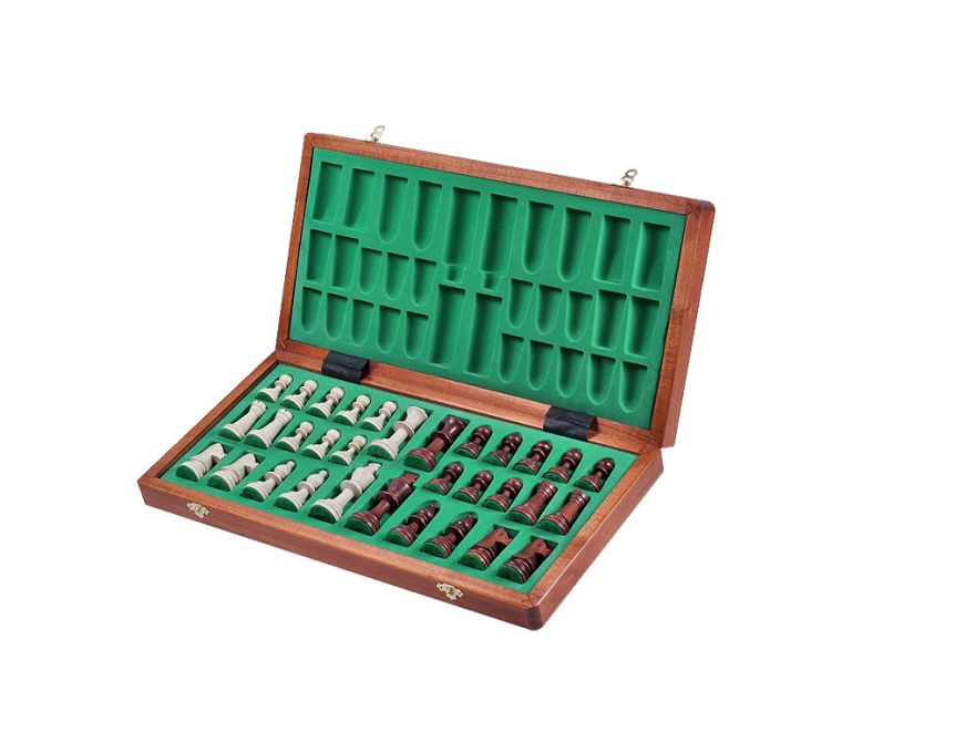 Lijepa sklopiva šahovska ploča ima umetnute (intarzija) pločice od mahagonija i platane. U šahovnici se nalazi šablona za pohranu figura.